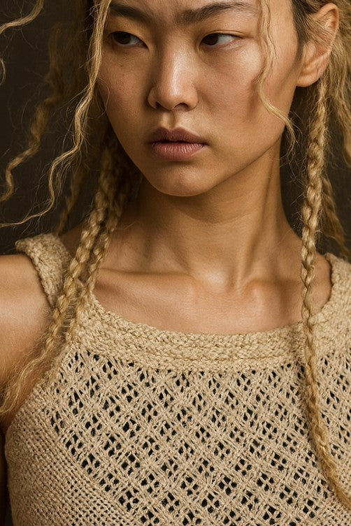 Every garment you see on our AI characters is real, wearable, and for sale - crafted in our signature couture lace-braided fabric. Tensengral brings back-to-earth comfort to elevated design, offering zero-waste camisole bras, dresses, and layers that mold to the body like living lace.