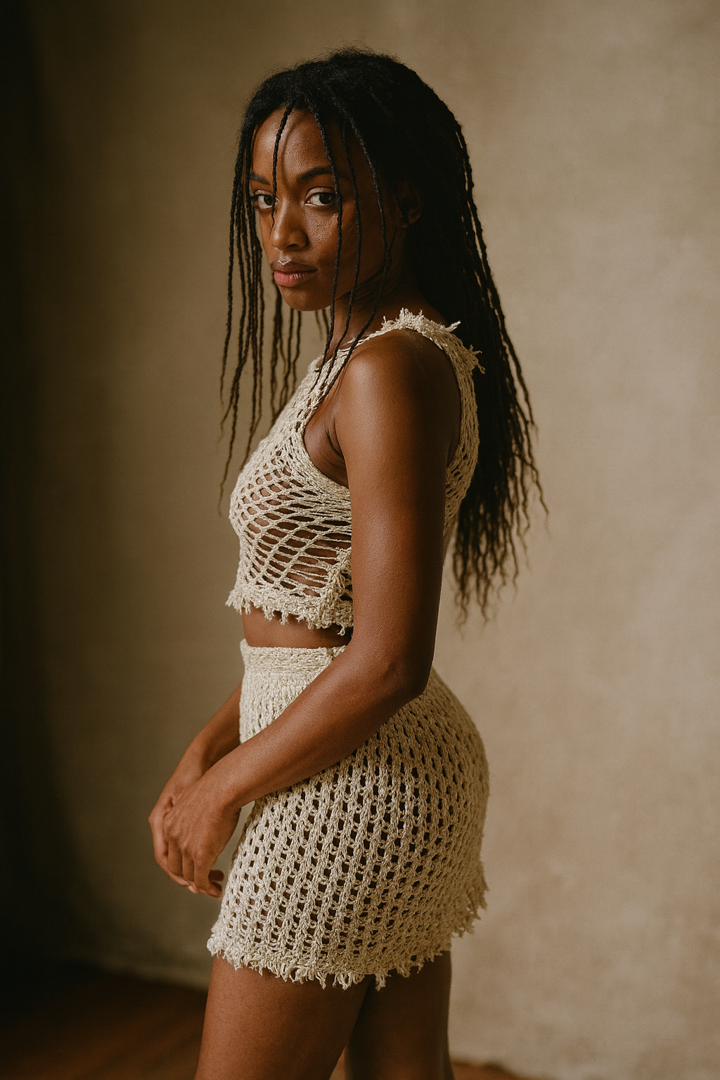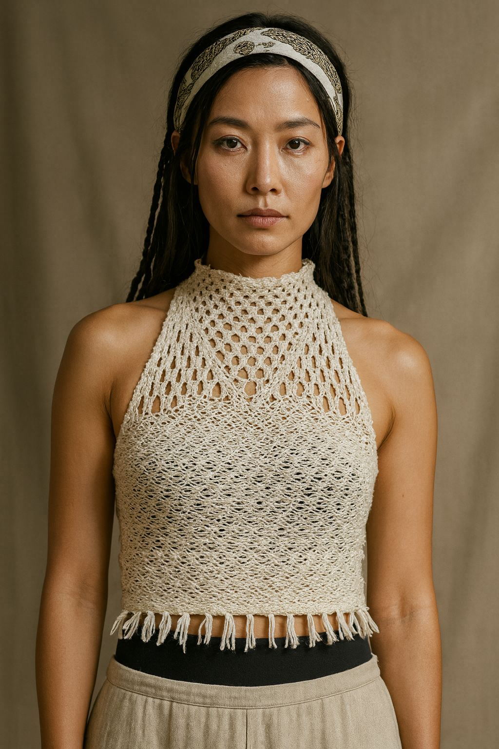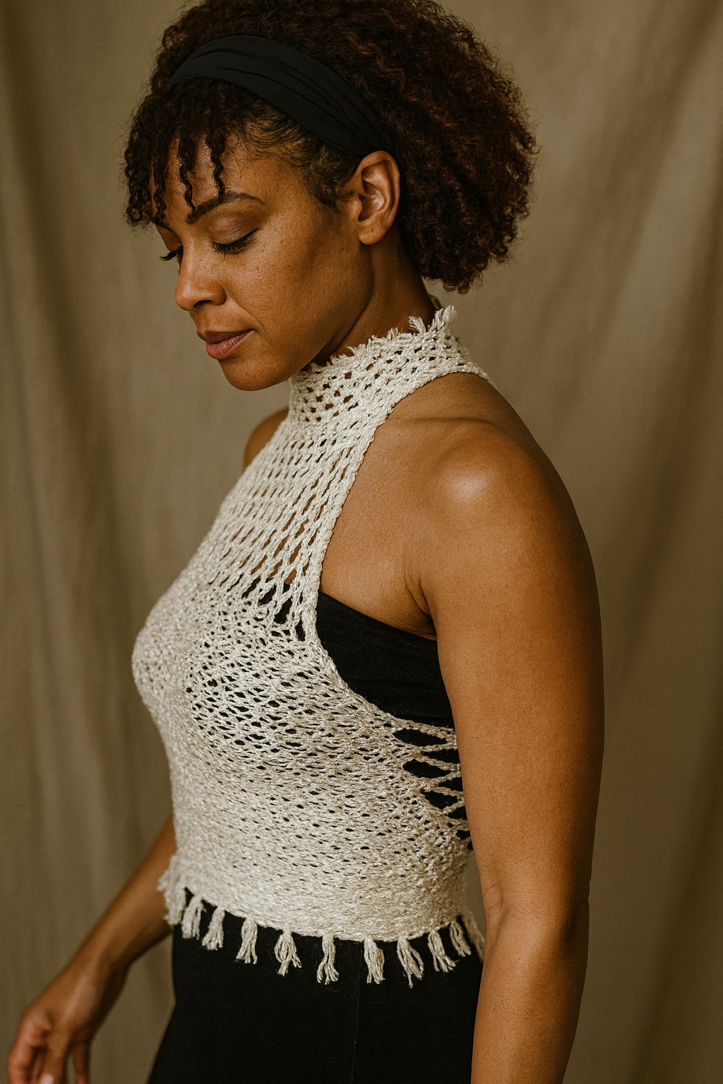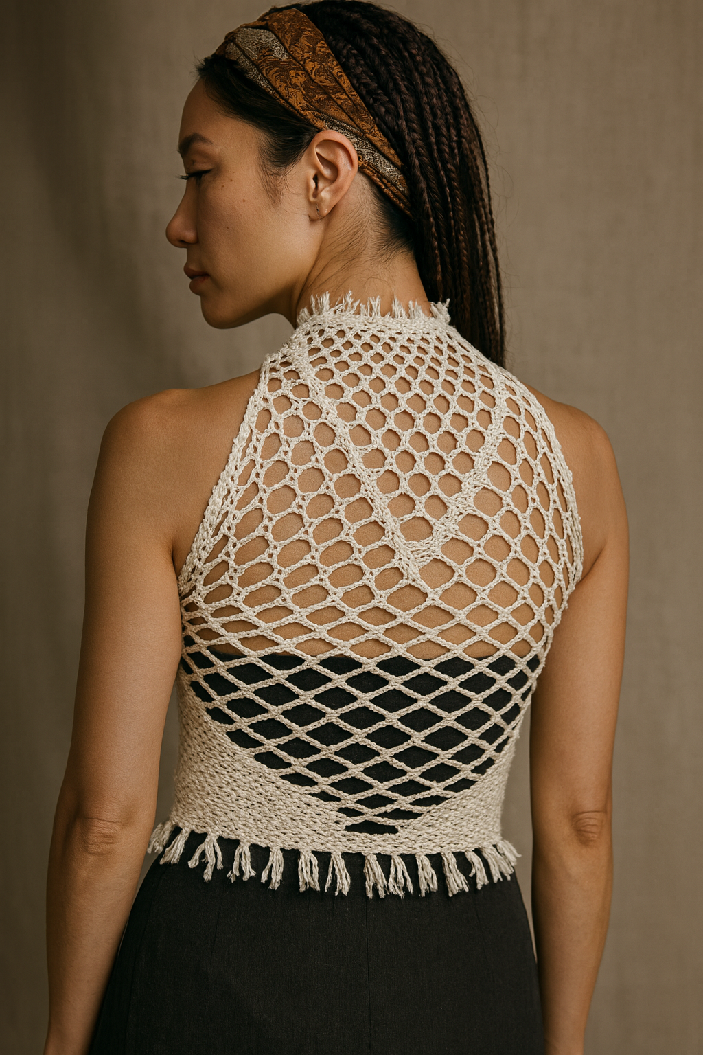The Turtle Tube Top is a sleeveless mesh-lace design with a high neck, hemline fringe, and gentle compression for comfort and versatility. Made in one piece from Supima® cotton and sustainable Lyocell TENCEL™, its intricate lace-braiding showcases Tensengral’s signature craft - perfect for layering or wearing on its own.