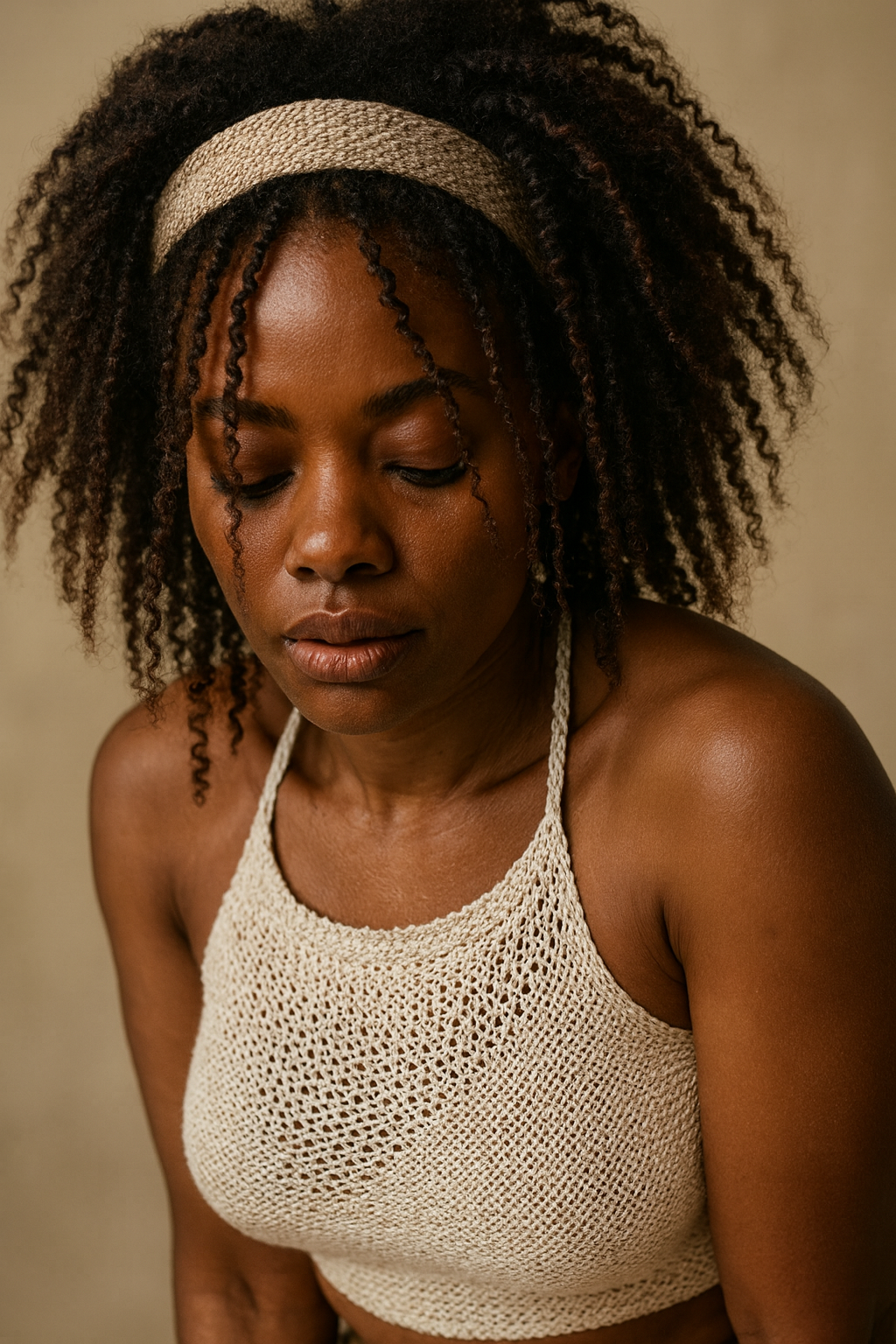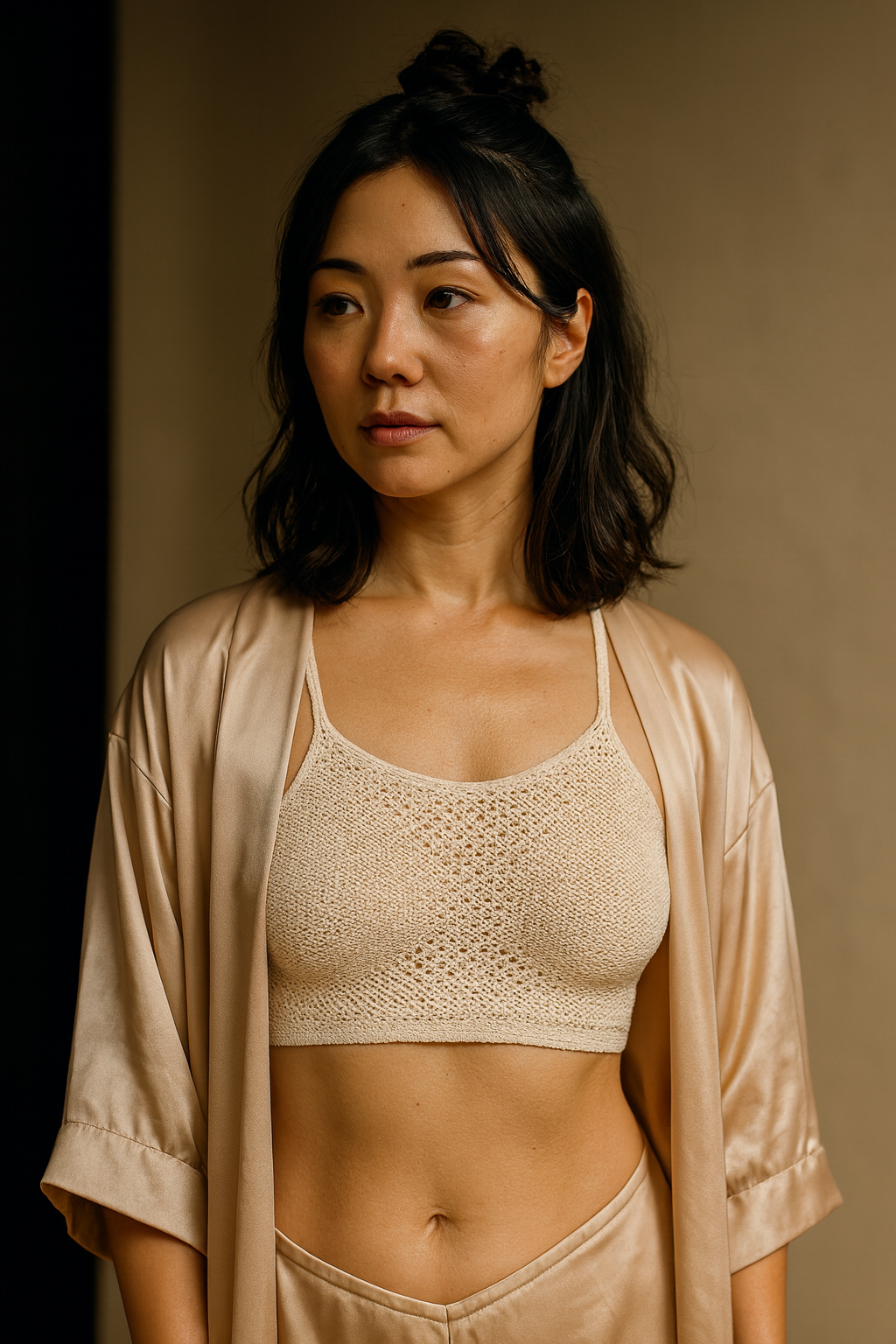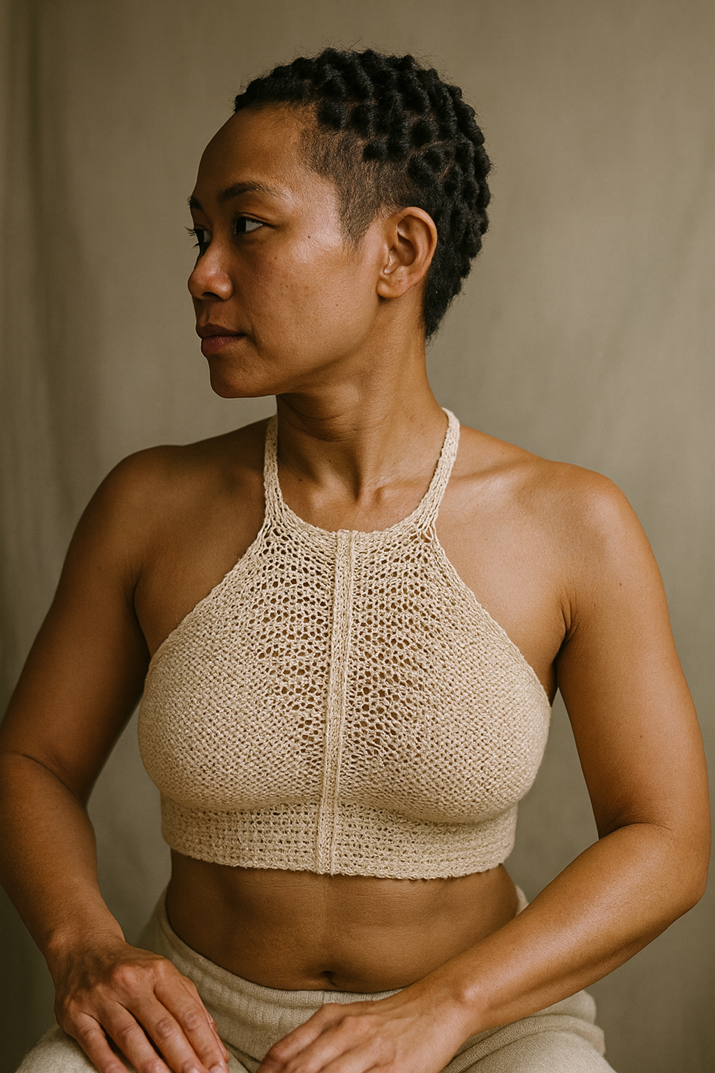 AMBI products are crafted using repurposed century-old lace braiding machines. The fabric is designed to work with the natural weight and motion of your breasts, distributing tension evenly across the bra's unified linked structure. This fabric inherently self-balances through subtle shifts in its pattern architecture, creating a hybrid material that combines the fluidity of a knit with the stability of a braid.