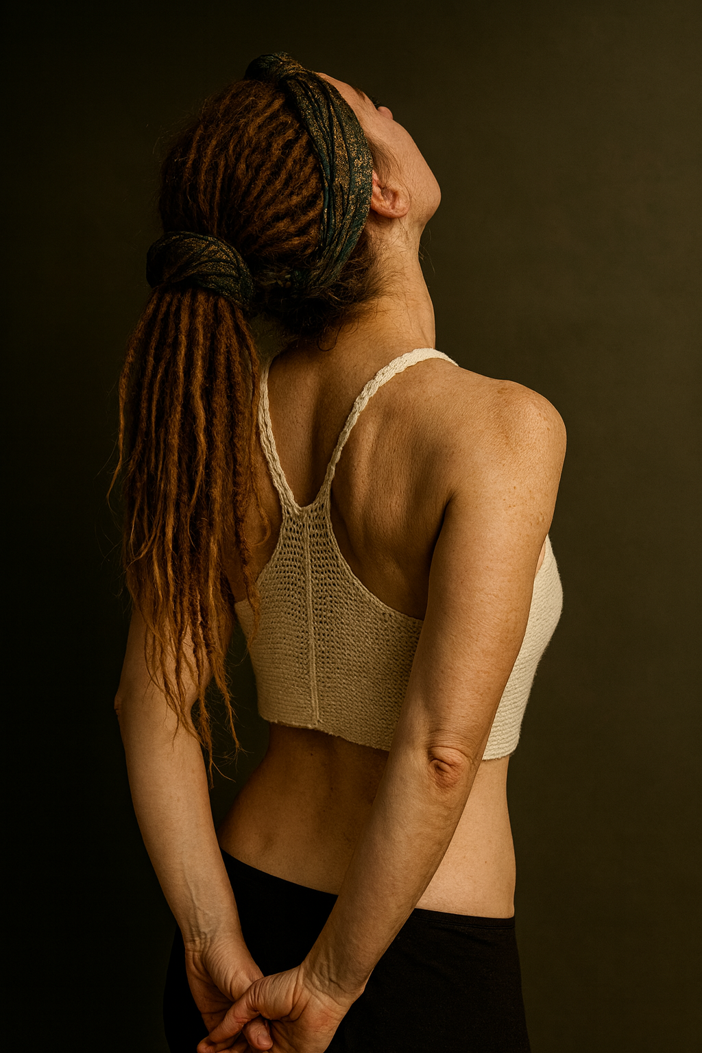 The tensioning yarn is interlaced into the Hi Side center of the Classic bra. This yarn utilizes a slip-knot to adjust the tension around the bra, gathering the fabric on the Hi side front, and shortening the overall width of the bra fabric. Tension can be varied to accommodate aesthetic and function preferences. The Classic Cut also has tie-able lacing on the Lo side for further adjustments.